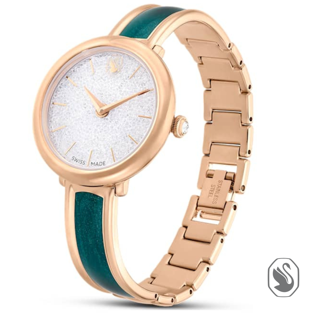 Một phần là đồ trang sức, một phần là đồng hồ, chiếc đồng hồ Crystalline Bangle này là một phụ kiện lấp lánh hàng ngày. Thiết kế thép không gỉ 32mm được hoàn thiện bằng tông màu vàng hồng và được đeo quanh cổ tay trên một chiếc vòng tay có thể điều chỉnh có phần giữa thanh lịch bằng men xanh. Trong một ví dụ tuyệt vời về kỹ thuật Crystalline của Swarovski, mặt số được trang trí bằng khoảng 1.016 viên pha lê, lấp lánh giữa các vạch chỉ giờ thanh mảnh và logo Swan ở vị trí 12 giờ. Một viên pha lê bổ sung cũng được đặt trong núm điều chỉnh. Chiếc đồng hồ sản xuất tại Thụy Sĩ này có khả năng chống nước ở độ sâu 50 mét và mang đến phong cách lấp lánh vào mọi thời điểm trong ngày.