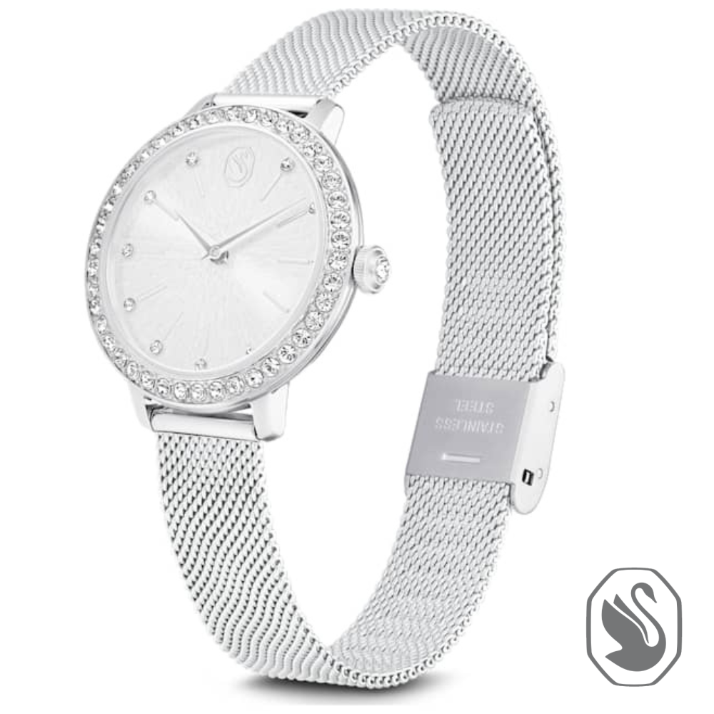 Chiếc đồng hồ Certa này được thiết kế sáng tạo để làm nổi bật bất kỳ trang phục nào. Vỏ tròn 30 mm được làm bằng thép không gỉ và có vành được đính 30 viên pha lê trong suốt. Bên dưới lớp kính khoáng, mặt số sunray màu bạc lộ ra, với logo thiên nga Swarovski ở vị trí 12 giờ, cùng với các vạch chỉ giờ được tạo ra từ pha lê cắt tròn. Ngoài ra còn có một viên pha lê duy nhất được đặt trong núm điều chỉnh của đồng hồ. Để tạo phong cách cho cổ tay, chiếc đồng hồ được trình bày trên một chiếc vòng đeo tay Milanese bằng thép không gỉ. Chiếc đồng hồ này có khả năng chống nước ở độ sâu 50 mét và sẽ giúp bạn đúng giờ cho những dịp hàng ngày với sự tinh tế tuyệt vời.