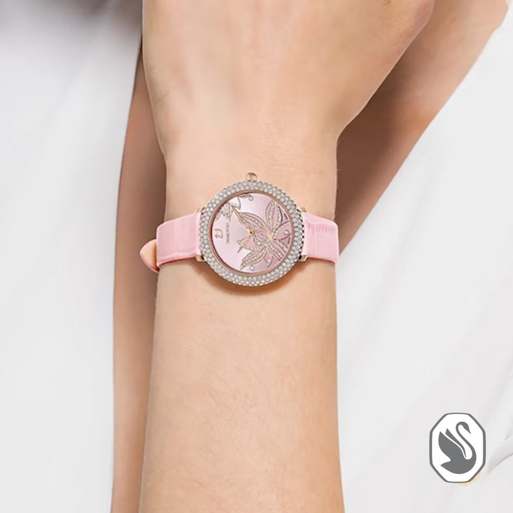 Vẻ đẹp của những khu vườn Trung Hoa đã truyền cảm hứng cho chiếc đồng hồ thanh lịch này của Swarovski. Vỏ đồng hồ phủ PVD tông vàng hồng được trang trí bằng khoảng 170 viên pha lê trong suốt, mang đến cho thiết kế những tia sáng lấp lánh và bổ sung hấp dẫn cho mặt đồng hồ màu hồng sunray và dây đeo bằng da. Mặt đồng hồ có các vạch chỉ số bằng pha lê và họa tiết hoa được thiết kế chi tiết đẹp mắt, được tô điểm bằng những viên pha lê trong suốt lấp lánh. Chiếc đồng hồ Swiss Made này hoàn hảo để thêm nét lãng mạn cho những bộ trang phục thanh lịch.