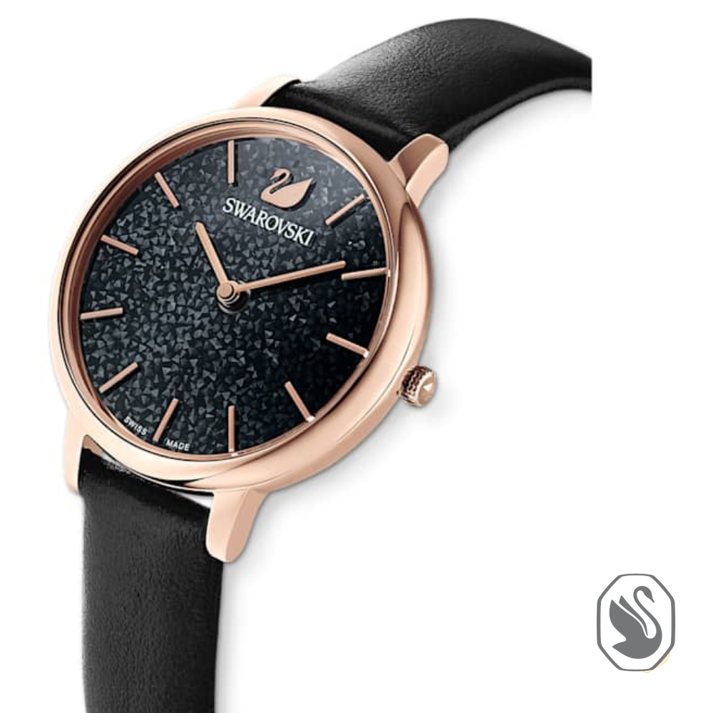 Tạo nên phong cách sành điệu với chiếc đồng hồ Swarovski dễ đeo này được kết hợp với sự lấp lánh của Crystalline mang tính biểu tượng. Vỏ thép không gỉ mạ PVD tông vàng hồng thanh lịch được phủ đầy pha lê đen để tạo hiệu ứng lấp lánh trên mặt đồng hồ hiện đại. Các vạch chỉ giờ tông vàng hồng và dây đeo bằng da bê Ý màu đen hoàn thiện thiết kế tinh tế. Lý tưởng cho mọi dịp, chiếc đồng hồ được sản xuất tại Thụy Sĩ và có khả năng chống nước ở độ sâu 50m. Sản xuất tại Thụy Sĩ.