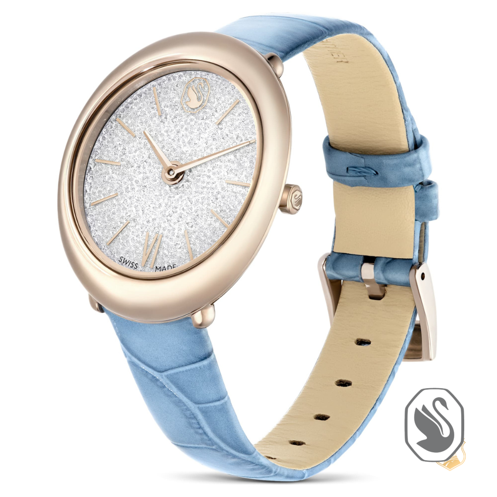 Đồng hồ Imber Oval truyền tải một cách tiếp cận hiện đại đối với chế tác đồng hồ thông qua mặt số lấp lánh và hình elip vượt thời gian. Phiên bản thép không gỉ 24 x 26,3 mm này được hoàn thiện bằng vàng sâm panh và có khoảng 1000 viên pha lê trong suốt trên mặt số Crystal. Trong số các vạch giờ mảnh mai, một chữ số La Mã duy nhất được hiển thị ở vị trí 6 giờ, trong khi thiên nga mang tính biểu tượng của Swarovski được đặt ở vị trí 12 giờ. Đồng hồ Swiss Made được đeo trên dây da màu xanh lam in hình cá sấu và có khả năng chống nước 50m. Hãy biến đây thành lựa chọn của bạn để tạo kiểu tinh tế từ ngày đến đêm.