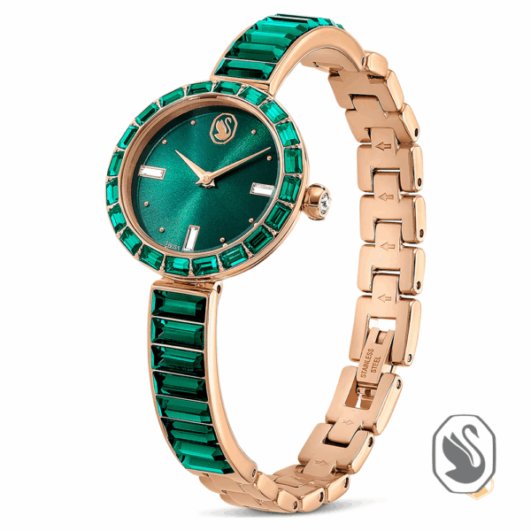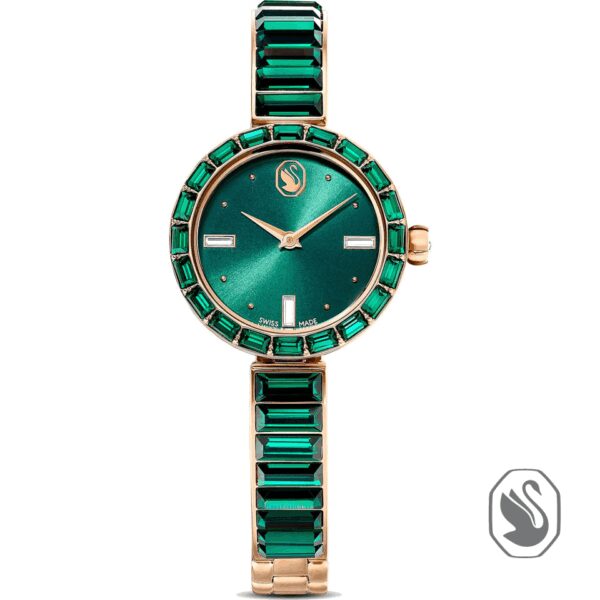 Sự thanh lịch được khuếch đại với các tinh thể trong chiếc đồng hồ lấy cảm hứng từ đồ trang sức tuyệt đẹp này. Thiết kế thép không gỉ 25 mm có lớp hoàn thiện tông màu vàng sâm panh và được bao quanh bởi vành bezel với 20 tinh thể màu xanh lá cây cắt baguette, trong khi một tinh thể duy nhất được đặt trong núm điều chỉnh. Các tinh thể cắt baguette cũng làm nổi bật ba điểm đánh dấu chỉ số trên mặt số màu xanh lá cây, cũng có logo thiên nga ở vị trí 12 giờ. Quanh cổ tay, vòng đeo tay kiểu vòng tay được trang trí bằng 16 tinh thể màu xanh lá cây cắt baguette và có thể điều chỉnh hoàn toàn để vừa vặn thoải mái. Chiếc đồng hồ sản xuất tại Thụy Sĩ này có khả năng chống nước ở độ sâu 50 mét và là phụ kiện lý tưởng cho một câu chuyện phong cách mê hoặc.