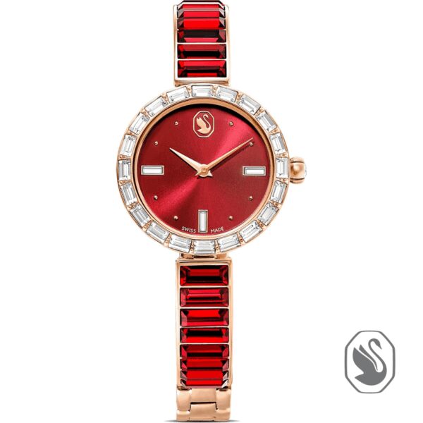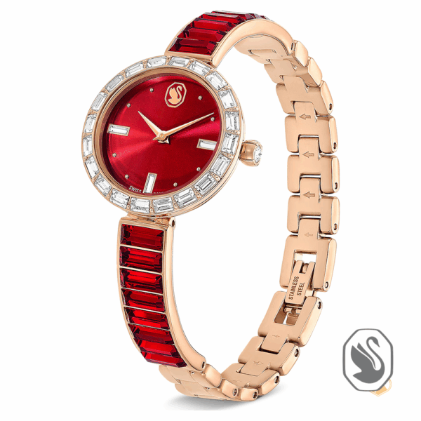 Sự thanh lịch được khuếch đại với các tinh thể trong chiếc đồng hồ lấy cảm hứng từ đồ trang sức tuyệt đẹp này. Thiết kế thép không gỉ 25 mm có lớp hoàn thiện tông màu vàng hồng và được bao quanh bởi vành bezel với 20 tinh thể trong suốt cắt kiểu baguette, trong khi một tinh thể duy nhất được đặt trong núm điều chỉnh. Các tinh thể cắt kiểu baguette làm nổi bật ba điểm đánh dấu chỉ số trên mặt số màu đỏ, cũng có logo thiên nga ở vị trí 12 giờ. Quanh cổ tay, vòng đeo tay kiểu vòng tay được trang trí bằng 16 tinh thể đỏ cắt kiểu baguette và có thể điều chỉnh hoàn toàn để vừa vặn thoải mái. Chiếc đồng hồ sản xuất tại Thụy Sĩ này có khả năng chống nước ở độ sâu 50 m và là phụ kiện lý tưởng cho những dịp đặc biệt.