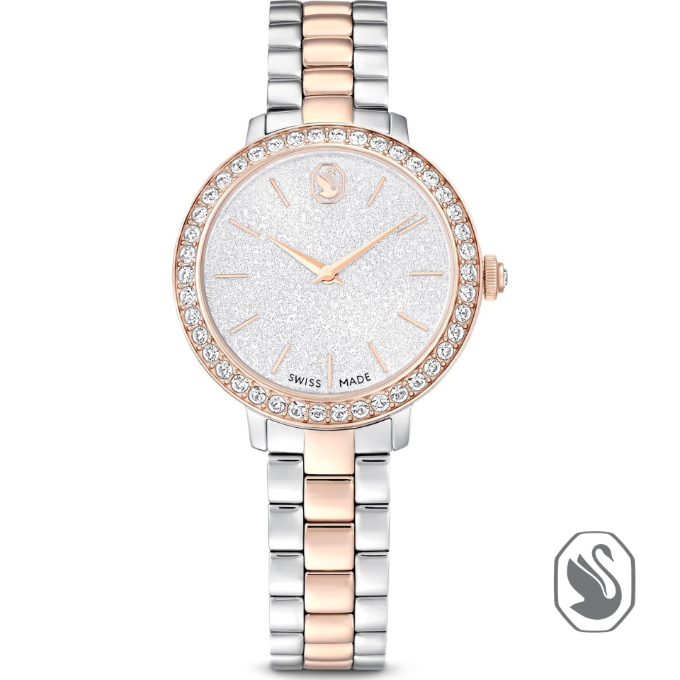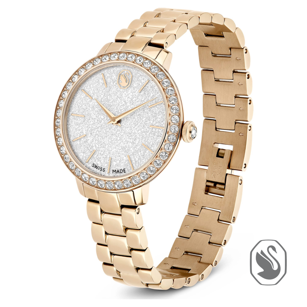 Lấy cảm hứng từ trang sức Matrix của Swarovski, chiếc đồng hồ 30mm này nắm bắt được cùng một cảm giác về phong cách đương đại và biểu cảm. Thiết kế thép không gỉ được hoàn thiện bằng vàng sâm panh và có vành bezel pavé được đính 42 viên pha lê. Mặt số tròn đẹp mắt được tạo hiệu ứng lấp lánh và bao gồm các vạch chỉ giờ và kim thanh mảnh, cũng như logo thiên nga ở vị trí 12 giờ. Cùng với một viên pha lê bổ sung được đặt trong núm điều chỉnh, chiếc đồng hồ này đáng chú ý với vòng đeo tay ba mắt, lướt nhẹ nhàng quanh cổ tay. Chiếc đồng hồ Swiss Made có khả năng chống nước ở độ sâu 50m và là người bạn đồng hành hoàn hảo cho mọi dịp. Lấy cảm hứng từ bộ sưu tập Matrix. Kích thước vỏ 1 1/8 x 1 1/8 inch. Độ dày vỏ 1/4 inch. Chiều dài đeo dây đeo (tối thiểu – tối đa) 4 7/8 – 7 1/2 inch. Chiều rộng dây đeo 1/2 inch. Chất liệu Pha lê, mạ PVD tông vàng sâm panh. Màu sắc Tông vàng. Kiểu khóa Khóa gập. Chất liệu dây đeo Kim loại. Sản xuất tại Thụy Sĩ. Bộ máy Thạch anh.