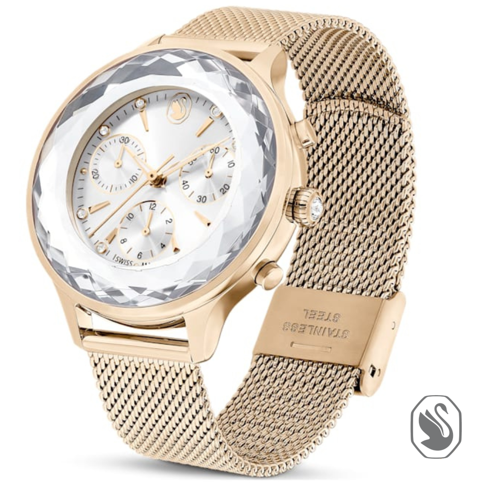 Tiêu biểu cho phong cách thể thao sang trọng, chiếc đồng hồ Nova Chrono này được chế tác tỉ mỉ để làm nổi bật sự tinh thông trong thiết kế của Swarovski. Vỏ thép không gỉ 37mm có lớp hoàn thiện tông màu vàng sâm panh và được tích hợp liền mạch với vành pha lê cắt cạnh đẹp mắt, cũng như mặt kính sapphire của đồng hồ. Điều này đóng khung mặt số sunray rạng rỡ, được trang trí bằng logo thiên nga, các vạch chỉ số pha lê và ba mặt số phụ bao gồm bộ đếm phút, bộ đếm giây và bộ đếm giờ. Quanh cổ tay, chiếc đồng hồ hiện đại này được đeo trên một dây đeo Milanese tháo lắp nhanh. Kim màu vàng sâm panh được phủ Luminova để tăng thêm độ sáng bóng. Chiếc đồng hồ sản xuất tại Thụy Sĩ này có khả năng chống nước ở độ sâu 50 mét, với một tinh thể duy nhất được đặt trong núm điều chỉnh và là sự lựa chọn linh hoạt cho cả công việc và giải trí.