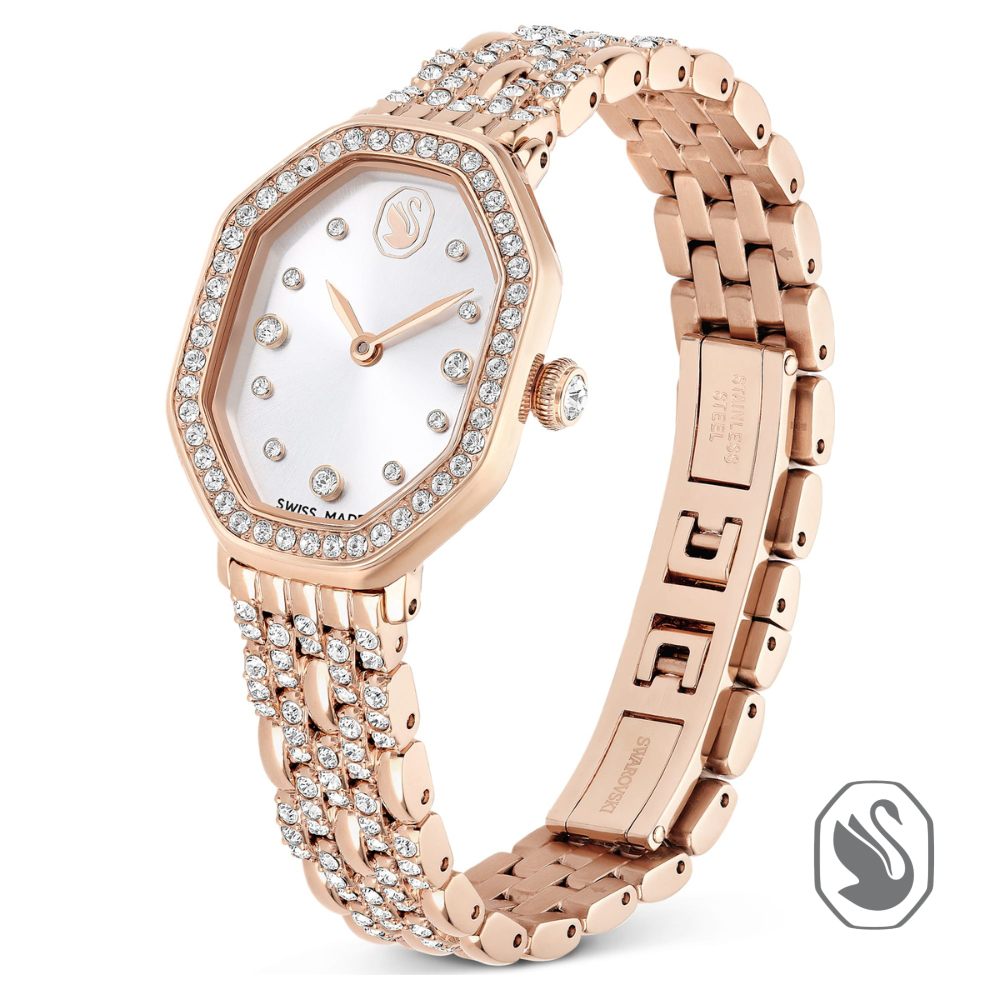 Lấy cảm hứng từ sự thanh lịch vượt thời gian của gia đình Dextera, chiếc đồng hồ 18 x 23 mm này được chế tác độc đáo theo hình bát giác mang tính biểu tượng của Swarovski. Được làm bằng thép không gỉ với lớp hoàn thiện tông màu vàng hồng, thiết kế có vành pavé được đính 46 viên pha lê và một viên pha lê bổ sung bên trong núm điều chỉnh. Mặt số tia nắng cũng bao gồm các vạch chỉ giờ bằng pha lê tinh tế, cùng với các kim thanh mảnh và logo thiên nga ở vị trí 12 giờ. Để hoàn thiện sáng tạo rạng rỡ này, vòng đeo tay năm mắt xích được trang trí bằng 108 viên pha lê cắt tròn, mang đến cho bạn sự lấp lánh bất tận ở mọi giờ. Chiếc đồng hồ Swiss Made này có khả năng chống nước ở độ sâu 50 mét. Bộ sưu tập Dextera Octagon. Kích thước vỏ 1 1/4 x 7/8 inch. Độ dày vỏ 1/4 inch. Chiều dài đeo dây đeo (tối thiểu – tối đa) 4 7/8 – 7 1/2 inch. Chiều rộng dây đeo 3/8 inch. Chất liệu Pha lê, PVD tông màu vàng hồng. Màu sắc Tông màu vàng. Kiểu khóa Khóa bướm. Chất liệu dây đeo Kim loại. Sản xuất tại Thụy Sĩ. Bộ máy Thạch anh.